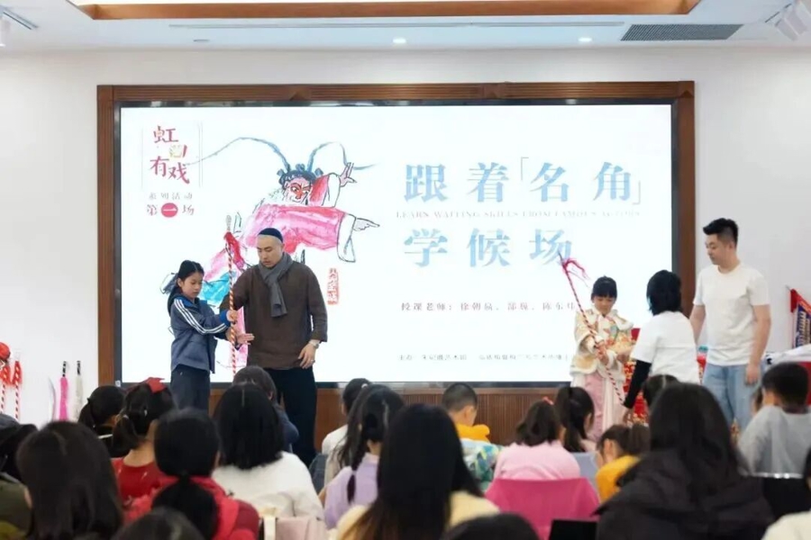 弘依梅暨梅兰芳艺术传播上海基地的三位青年京剧演员带着孩子们“跟着名角学候场”。