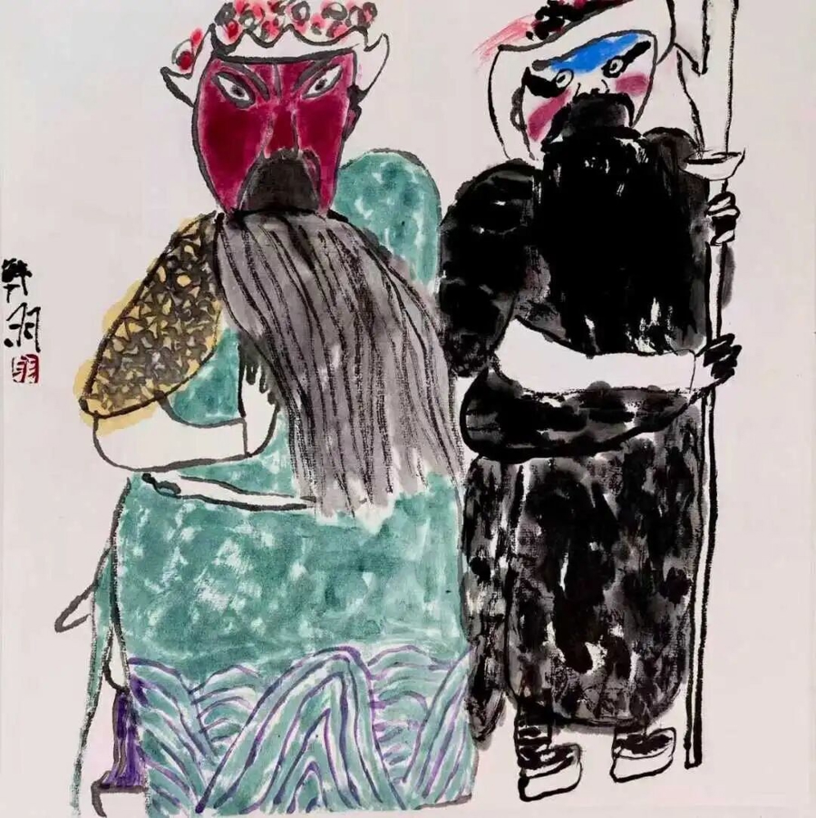 今年94岁的韩羽同样是戏曲人物画大家。早在上世纪七八十年代,他担任人物造型的动画片《三个和尚》即获电影金鸡奖、柏林国际电影节银熊奖等,此次展览除了展示韩羽的《三个和尚》,也展出了《白蛇传》《单刀会》《失街亭》等多件他的戏曲人物画精品。